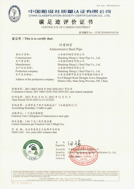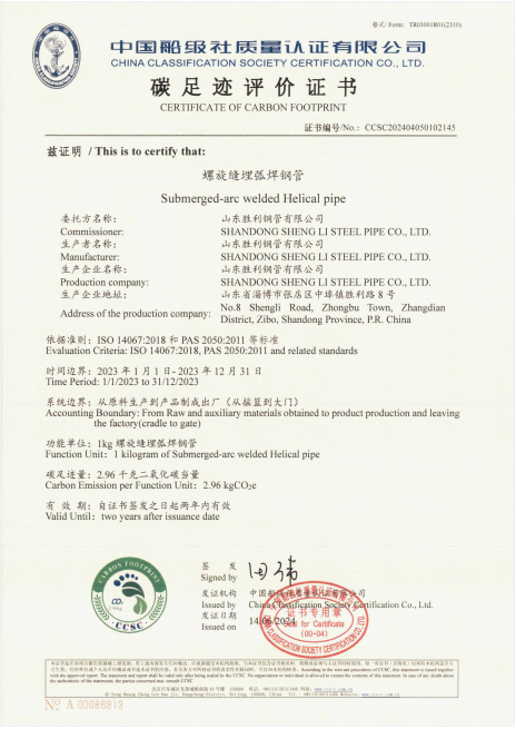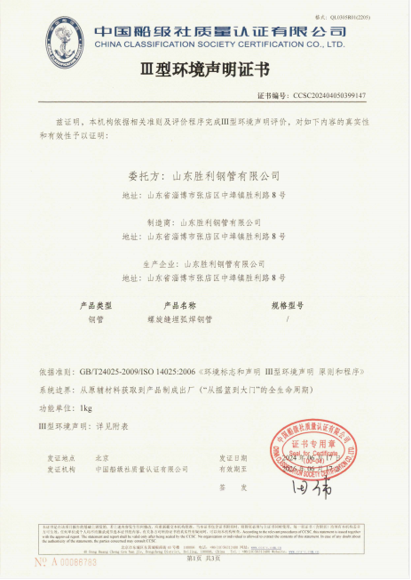 山東勝利順利通過螺旋縫埋弧焊接鋼管和防腐鋼管的碳足跡、Ⅲ型環(huán)境聲明評價認證